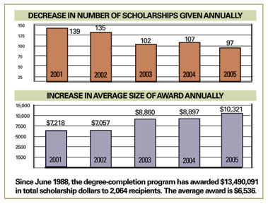 Between 2001 and 2005 — the most recent year for which data are available, the average award distributed by the committee has increased from $7,218 to $10,321. Meanwhile, the number of scholarships the committee has awarded has decreased from an all-time high of 139 in 2001 to just 97 in 2005, the lowest since 1995. In 1989, the first full year of the program, the average award amount was $5,620. Since its inception, the program has awarded 2,064 scholarships, totaling nearly $13.5 million disbursed to help former student-athletes complete their degrees.