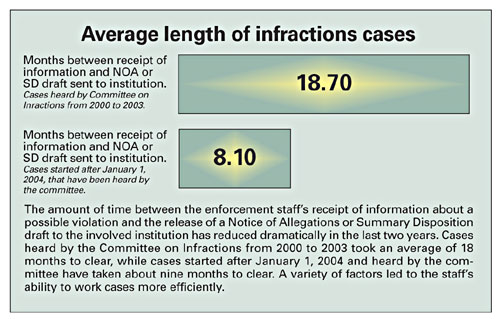 Their endeavors are working: In 2005, the enforcement staff and the infractions committees in all divisions cleared 19 cases — seven more than in 2004 and the highest number in more than 15 years. When comparing cases heard by the committees from 2000 to 2003 with those investigated after