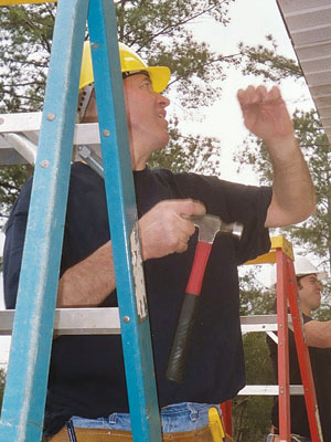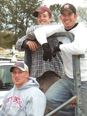 Habitat helpers — North Central College (Illinois) student-athletes traveled to South Carolina recently to work on a project for Habitat for Humanity. Above, North Central student-athletes Kraig Kniss (foreground) and Kam Kniss work on the eaves and soffits. Below, linebacker Wes Kostellic, defensive back Timm Bellazzini and quarterback Kam Kniss appear satisfied with a job well done.