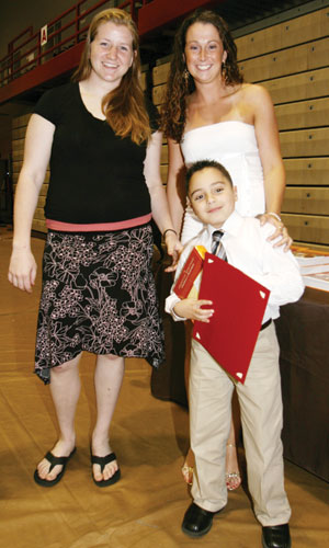 Honoring achievement — Brown University’s athletics department honored 18 grade school students at its annual all-sports banquet this spring. Each classroom at an elementary school selected its top student to receive a dictionary commemorating their outstanding academic work. Brown student-athletes have conducted outreach projects at the school for the last 15 years. Above, Ashley King-Bischof (basketball) and Margaret Ramsey (ice hockey) pose for a photo with second-grader Jordan Rosa.