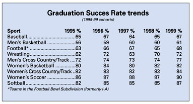 The research also lists the annual overall GSR by sport for the entering classes from 1995 through 1999. Those data show that the GSR for men has increased from 68 percent to 71 percent, and from 85 to 88 percent for women. Men’s basketball went from 56 percent to 61 percent in the same period, while Football Bowl Subdivision teams went from 63 percent to 68 percent.