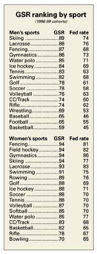 The data is from the four-class aggregate of entering classes from 1996 through 1999, for which the NCAA has compiled sport-by-sport GSR and the comparable graduation rate using the federal methodology required annually of colleges and universities through the 1990 Student Right-to-Know Act.