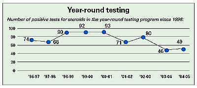 In year-round testing, 49 student-athletes tested positive for steroids in 2004-05, compared to 93 positive tests in 2000-01. An all-time low of 46 student-athletes tested positive for steroid use in the 2003-04 year-round testing program, in which 8,980 student-athletes were tested. A total of 10,094 student-athletes were tested for steroids in the 2004-05 year-round testing program.