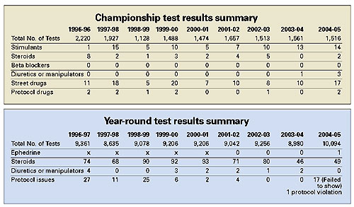 The report indicated a rise in the number of positive results for street drugs in the 2004-05 postseason testing program. That includes two positive results for cocaine, one of which also tested positive for THC. A total of 17 student-athletes tested positive for street drugs in 2004-05 compared to just 10 in 2003-04.