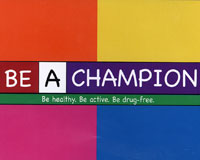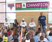 The NCAA Hall of Champions hosted a "Be A Champion" event during the recent USA Outdoor Track and Field Championships in Indianapolis in conjunction with USA Track and Field, Anthem, and the American College of Sports Medicine. The program promotes physical fitness for children, living a positive lifestyle and staying in school. At left, Jeremy Wariner, 2004 Olympic gold medalist, speaks to the group. At right, steeplechase specialist Daniel Lincoln (left), sprinter Kia Davis, and Olympic relay teammates Darold Williamson and Wariner listen to Jon Drummond, another gold and silver medalist, address children during the event. All of the athletes competed at NCAA institutions — Wariner and Williamson at Baylor, Lincoln at Arkansas, Davis at Saint Augustine’s and Drummond at TCU. Photos by Marcia Stubbeman/The NCAA News.