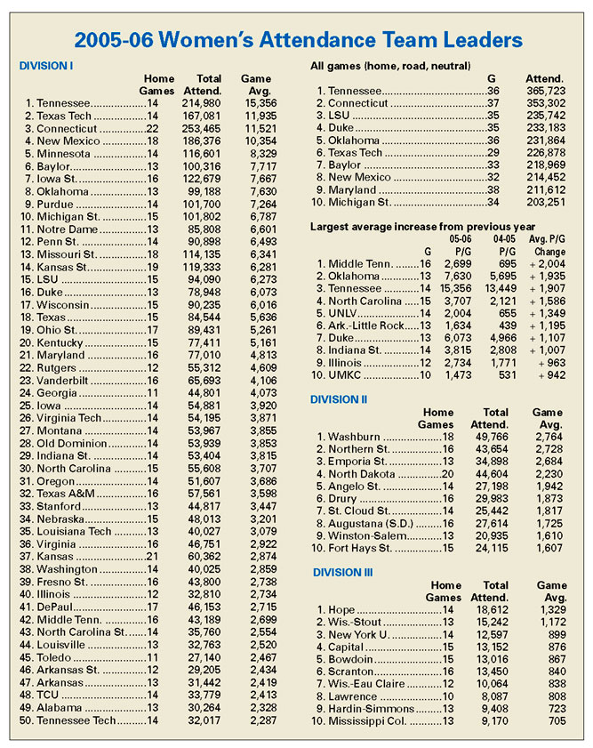 In single-team home attendance, Tennessee claimed the No. 1 spot for the ninth time in 10 years. With a total of 214,980 fans over 14 home games, the Lady Volunteers’ average crowd was 15,356. Tennessee also had the top overall attendance, with 365,723 fans showing support at home, away and neutral-site games. Connecticut saw the highest home total with 253,465 spectators visiting the Hartford Civic Center and Gampel Pavilion, while Middle Tennessee enjoyed a huge jump in average, from 695 fans per game in 2004-05 to 2,699 in 2005-06.