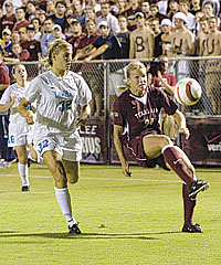 Texas A&M University, College Station, kicked off the women’s soccer season August 25 with a significant upset, knocking off the 18-time national champions from the University of North Carolina, Chapel Hill, 1-0, in double overtime. The loss was the first in a season opener for the Tar Heels since 1983. Texas A&M’s Ashlee Pistorius (right) scored the winning goal in front of an NCAA regular-season, record crowd of 8,204 at Aggie Soccer Stadium.Photo courtesy of Texas A&M media relations