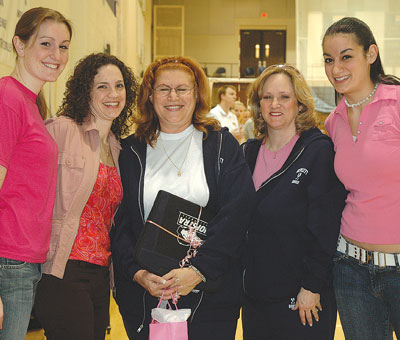 Helping fight cancer — Each spring the Hofstra University volleyball team hosts a 15-team invitational tournament that provides a highly competitive environment for regional rivals. This year’s tournament, however, was not only a stage for these female athletes to display their talents, but also an important fund-raiser for breast cancer research. Two Hofstra seniors, Jessica Levy (far right in photo) and Tessa Sphar (far left), worked with the Long Island Breast Cancer Action Coalition and raised more than $1,700 in donations.