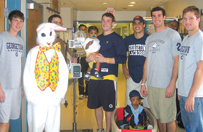 Hospital visit brings cheer — The Georgetown University men’s lacrosse team visited the Concentrated Care Center of the Georgetown University Hospital recently, spending the afternoon with child patients. Activities ranged from hunting for Easter eggs to decorating cookies and participating in arts and crafts. “It was a good visit,” said junior midfielder Dave Bauer, who coordinated the visit. “The kids got something out of it, and we definitely got something out of it. It’s just nice seeing those kids with smiles on their faces.” The Concentrated Care Center offers highly specialized intensive care and extensive patient monitoring systems for the acutely ill.