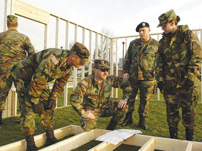Members of the 1413th Indiana National Guard Engineering Detachment study the plans for one of three house frames built April 2 during the Men’s Final Four in