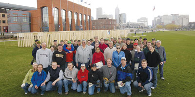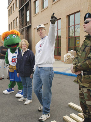 Above, Frank Hartman of Habitat for Humanity of Greater Indianapolis explains the building process to volunteers as Melody Lawrence, NCAA associate director for community relations, and JJ Jumper look on.