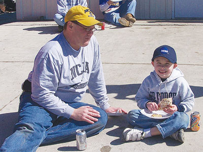 Mike Racy, NCAA vice president for Division II, takes a break for lunch with his 6-year-old son, Zac, during a Habitat for Humanity build.
