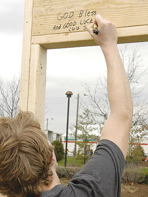 Left, a volunteer at the Men’s Final Four Habitat build signs a good-luck message on one of the house frames built over a five-hour period near the NCAA Hall of Champions.