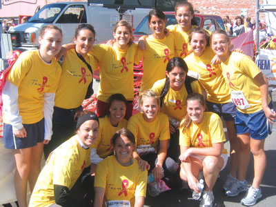 Gonzaga University head women’s soccer coach Shannon Stiles (second from left standing) and team members gathered at the finish line after their participation in the Eastern Washington Race for the Cure in Spokane, Washington, April 30. “Team Lisa” was one of the 94 participating teams in the race sponsored by the Susan G. Komen Breast Cancer Foundation. Team Lisa led the way by raising more than $30,000. Team Lisa was formed in honor of Stiles’ 36-year-old sister-in-law Lisa Gyllenhammer, who died in January after a three-year battle with breast cancer, leaving behind a husband and three young sons. The T-shirts were designed by Chris Stiles, Gyllenhammer’s brother and