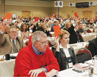 In a lighting-fast business session January 9, delegates approved 37 proposals either by a show of paddles or by pluralities of 90 percent or more. The only two votes that were close — Proposal Nos. 31 and 34 — both were defeated. The business session took only two and one-half hours, and voting on the 39 proposals (one was withdrawn on the Convention floor) was accomplished in one hour and 56 minutes.