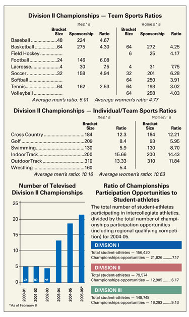 Only 10 years ago, the Division II Softball Championship included 24 teams. Two bracket expansions later, 64 teams now compete annually in the event. The men’s and women’s basketball championships both have grown to 64 teams. Women’s soccer included 12 teams as recently as 1996; today, it features 32. In 2007, 48 teams will participate.