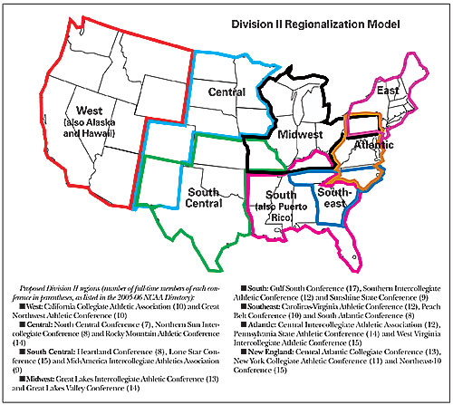 The proposal to change regionalization was essentially the same one that was presented to the Convention in January — that is, to divide the nation into eight geographic regions based on state boundaries and conference memberships. States with members from more than one conference would be part of more than one region. All games against conference opponents and opponents within the region would count as in-region games; also, institutions would be able to count games against opponents from contiguous states as in-region contests. Less-sponsored sports would have only two or four regions, but those regions would be created by combining regions established through the new plan.