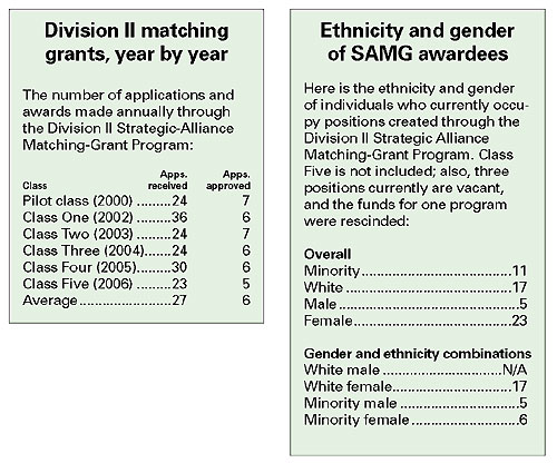 The Strategic Alliance Matching-Grant Program has not had a large per se effect on the number of women and minorities working in Division II athletics. After all, only 37 positions have been created, and (with turnover) only 63 people have filled those positions. That’s only about 1.5 percent of the 4,000 Division II positions that were reported in the 2003-04 NCAA race and gender demographics report.