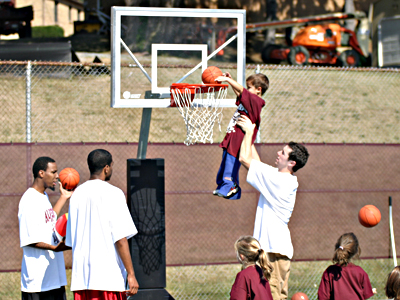 Alvernia College used funds from an NCAA Division III Initiatives Grant to host a Community Youth Field Day. The schedule included five groups of kids rotating through eight events that incorporate most of the 15 varsity sports. The gym was filled with the sound of dribbling basketballs, while the outdoor rec center was bustling with beach ball volleyball. The softball and field hockey fields were hosting golf and tee-ball events as well as foam-ball hockey and a water-soaked relay event. Meanwhile, the action on Schlager Memorial Field was a football/soccer hybrid that had local youngsters claming to be NFL superstars.