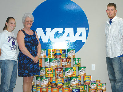 Meals on Wheels donation — University of the Ozarks (Arkansas) student-athletes Jessica Pianalto (left) and Curt Dixon (right) present Ruby Frazier, site director at the Johnson County (Arkansas) Senior Center, with food donations for the county’s Meals on Wheels program. The school’s Student-Athlete Advisory Committee coordinated the food drive held in conjunction with this year’s National Student-Athlete Day. Pianalto, a member of the softball team, and