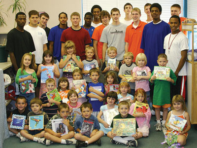 Reading rocks — The Olivet College men’s basketball team is in its second year of a program called “Comet Readers.” Twice each semester, the team visits an elementary school to read to students. At the school’s library, each player sits down with a student or two (depending on class size) and reads a book to them. During each visit, the varsity team reads to one class while the junior varsity reads to another. Above, student-athlete Jon Teuber reads to his new friends.