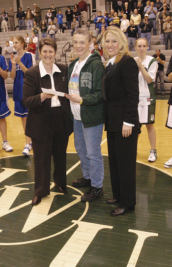 Before its January 10 home game against Millikin University, the Illinois Wesleyan University women’s basketball team contributed to the Coaches vs. Cancer fund in the name of physics professor Linda French (center). French, a cancer survivor, is a longtime supporter of Illinois Wesleyan women’s basketball with a regular seat directly behind the bench. Team members and coaches raised donations, and Illinois Wesleyan head coach Mia Smith (right) presented the proceeds to Millikin coach Lori Kerans (left), a cancer survivor active in the Coaches vs. Cancer program. Coaches vs. Cancer is a community-funded program designed to reduce youth risk of cancer by focusing on research, prevention, education and patient services of the American Cancer Society.