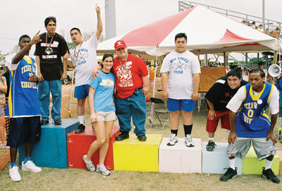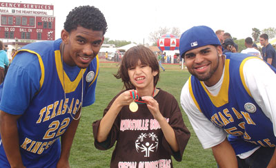 — Texas A&M University-Kingsville student-athletes helped out at the Coastal Bend Special Olympics this past spring by showing youngsters various aspects of sport. Athletes from the men’s basketball and volleyball teams were among those who interacted with the Special Olympians. Above, from the left, basketball players Darrell Blackburn and Juan Lanauze pose with a fan. Left, basketball’s Kia Griffin (left), volleyball’s Kara Maughan and basketball’s Ricky Huckaby pose for a photo.© 2010 The National Collegiate Athletic Association