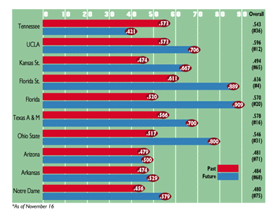 Not counting games in which it has participated, Florida State's past and future opponents have a winning percentage of .636. That is the fourth-best schedule strength in the nation, trailing only Auburn University (.722); the University of Missouri, Columbia (.659); and Louisiana State University (.659).