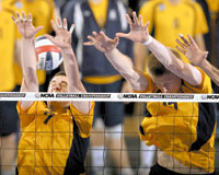 Brian Thornton (left) and David Smith of UC Irvine try block an attack by Indiana/Purdue-Fort Wayne during the National Collegiate Men’s Volleyball Championship. The two combined for six total blocks in the Anteaters’ victory. In addition, Smith contributed 13 kills and Thornton 59 assists. Jamie Schwaberow/NCAA Photos.