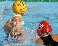 Courtney Mathewson (left) of UCLA avoids pressure from Stanford’s Katie Hansen during the National Collegiate Women’s Water Polo Championship game. Mathewson scored three of the Bruins’ five goals and was named to the all-tournament team. Jamie Schwaberow/NCAA Photos.