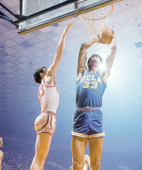 Lew Alcindor (Kareem Abdul-Jabbar) of UCLA prepares to dunk over Dayton’s Dan Sadlier in the 1967 NCAA championship game. The dunk was banned from college basketball the following season, and it remained outlawed until the 1976-77 season. Photo by Rich Clarkson.
