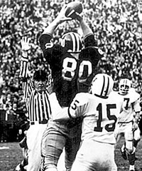 Harvard receiver Pete Varney (No. 80 in photo at left) catches the two-point conversion that tied Yale with no time left on the clock. The 29-29 tie remains one of the greatest moments in the series known as “The Game.”