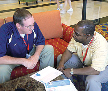 Coast Guard SID Jason Southard (left) and CSTV’s Scottie Rodgers discuss an upcoming Young CoSIDA event in San Diego. Nearly 200 people attended a luau sponsored by the group, which is the unofficial social arm of the organization.