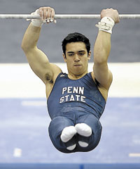 Shaun Antonio of Penn State competes in the horizontal bar during the National Collegiate Men’s Gymnastics Championships. Penn State scored 221 points to reclaim the national title that it last won in 2004. Jamie Schwaberow/NCAA Photos.