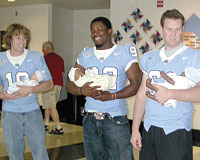 Helping the youngest among us — University of North Carolina, Chapel Hill, football student-athletes recently participated in the campaign to prevent shaken-baby syndrome. The campaign, called “Real Men Rock,” was organized by Orange County agencies and the UNC Hospital’s Beacon Child and Family program and was designed to teach men how to care for crying babies. National research on babies for whom treatment has been sought indicates that about 1,200-1,400 children have been shaken.