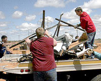 Tornado cleanup—Members of the Eastern New Mexico University football team sprang into action a day after tornados ripped through Portales and Clovis, New Mexico, March 23, causing extensive to the Grande Vida Dairy, which had been operating only since December 2006. The student-athletes did everything from picking up large tin siding, steel irrigation pipes and tires to tearing down damaged cement walls and fences.