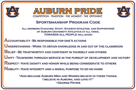 It reads, “Auburn University is committed to sportsmanship among its coaches, student-athletes, staff and supporters. We believe that sportsmanship is playing fairly, acting respectfully toward others, and promoting the interest and good name of Auburn University on and off the field of play.”