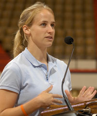 Summer Ragsdale, a soccer student-athlete and chair of the Auburn Student-Athlete Advisory Committee, introduced Auburn Pride at a recent meeting of all student-athletes and administrators. The sportsmanship program emphasizes to Auburn’s 21 teams that integrity on the fields and courts is paramount.