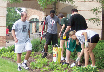 Beautifying the campus — Eastern Michigan University student-athletes and administrators have recently displayed pride in their surroundings. Football student-athletes and administrators participated in Ypsilanti Pride Day May 19. The event, organized by the Ypsilanti Chamber of Commerce, was designed to beautify the parks, streets and neighborhoods in Ypsilanti. Just weeks later, the football student-athletes were at it again, joined by members of the women’s volleyball, men’s golf, baseball and women’s tennis teams as well as Eastern Michigan faculty and staff members for Eastern Michigan University Pride Day. On June 1, the student-athletes spent time landscaping and otherwise improving the campus. The event was organized by the business and finance department and the employees of the campus physical plant.