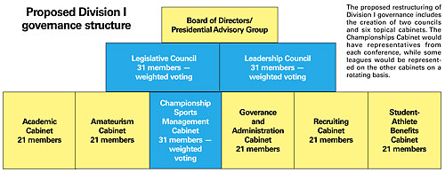 The latest idea calls for the current 49-member Management Council to be replaced with two 31-member groups called the Leadership Council and Legislative Council. In addition, the current Championships/Competition and the Academics/Eligibility/Compliance Cabinets would be replaced by a 31-member Championships/Sports Management Cabinet and five 21-member cabinets covering the following areas: