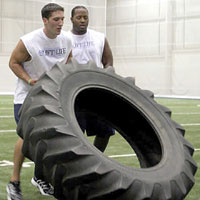 Lift for Life — Pennsylvania State University football student-athletes raised money for the Kidney Cancer Association recently. Linebacker Navorro Bowman (left photo) participates in the weight carry, while teammates Anthony Morelli (left in photo at right) and Austin Hinton complete the giant tire flip. The student-athletes competed in 11 strength and endurance events before more than 3,000 fans.