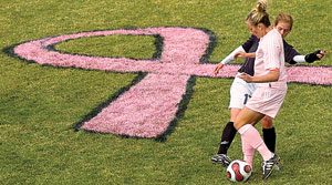 The Southern Utah University women’s soccer team wore pink uniforms at a game against Embry-Riddle October 13 to raise awareness of breast cancer. The team raised $1,200 for research through merchandise sales and donations. Adidas donated the special jerseys. Custom-made shirts featuring the Southern Utah logo in pink sold out within the first 20 minutes of the game. Photo by Garrett Davis/The Spectrum & Daily News