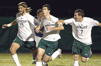 State University of New York at Binghamton’s Justin Leskow, Cameron Keith and Darren McAllister celebrate during a three-goal outburst against the University of Maine, Orono, on October 22. The Bearcats scored three goals in the first 1:37 of the game, the sixth-fastest three-goal spurt in NCAA history. Photo by Jonathan Cohen.