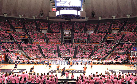 Assembly Hall, traditionally awash in orange to support the University of Illinois, Champaign, men’s basketball team, turned pink for the first practice of 2007 as part of a fund-raiser for the American Cancer Society.