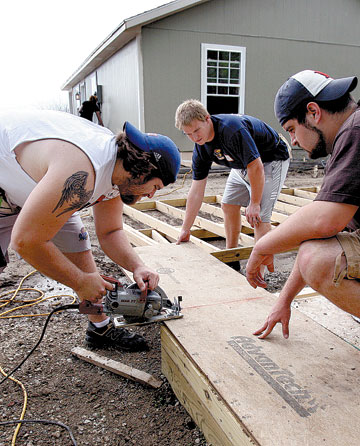 Habitat helpers — University of Kansas football player Ryan Cantrell cuts panels for a shed with the help of teammates Scott Webb (center) and Kayl Anderson during a recent Habitat for Humanity build. Student-athletes and university staff members volunteered their time in the community of Lawrence to help build three different homes.