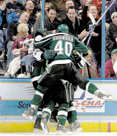 It’s a goal! — Tim Crowder (No. 40) of Michigan State University leaps into his teammates celebrating a goal against Boston College during the Division I Men’s Ice Hockey Championship. Michigan State defeated Boston College, 3-1, to win the national title. See Division I for full story.
