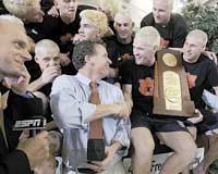 Auburn head coach David Marsh shakes hands with diver Steven Segerlin while team members celebrate their fifth straight national championship. Marsh also has coached the Auburn women’s team to five titles and has won 12 overall.