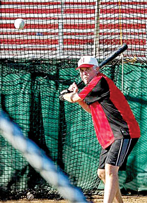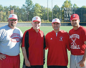 Presidential poke — University of Hartford President and former NCAA Executive Committee Chair Walter Harrison took batting practice recently with Hawks head coach Jeff Calcaterra on the mound. Afterward, Harrison posed with Calcaterra (left), assistant coach Mike Susi (second from right) and assistant coach Inaki Ormaechea (far right). A longtime baseball aficionado and former student-athlete, Harrison wrote his doctoral dissertation about the sport. He currently serves as chair of the Division I Committee on Academic Performance.