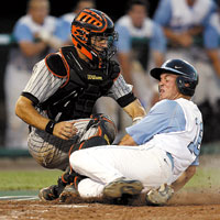 Oregon State catcher Mitch Canham tags out North Carolina’s Tim Fedroff during the Men’s College World Series final at Rosenblatt Stadium. Canham had two hits and scored twice as Oregon State defeated North Carolina, 9-3, for the national title. Jamie Schwaberow/NCAA Photos.