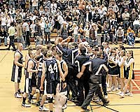 Players and cheerleaders from the Mansfield High School basketball team celebrate their victory in the Pennsylvania state playoffs at Mansfield University’s Decker Gymnasium. The event was one of many during the year at Mansfield that unites the campus and the community.